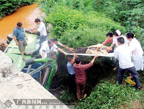 上午8時50分,蘇圩鎮(zhèn)那海村村民梁仕元在村口搭乘這輛開往南寧的客車。十幾分鐘后,他感到客車開始搖擺,他雙手緊緊抓住座椅,雙腳蹬住前面的椅子,把自己的身體固定住。緊接著,客車就撞斷那花橋的幾個護欄,沖進橋下的水溝邊?蛙嚊_下橋的過程中,梁仕元被撞得頭有點暈,好在只是受點輕傷,他從車窗爬了出來。