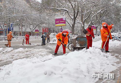 11日下午,在山西太原市街頭,一片銀裝素裹。街頭兩旁一些樹枝被大雪壓斷,受暴雪的影響街道上行駛的車輛明顯減少,一些環(huán)衛(wèi)工人正在緊急清掃路面上的積雪,居民出行只能選擇步行或乘坐公交汽車。攝影:張雷杰
