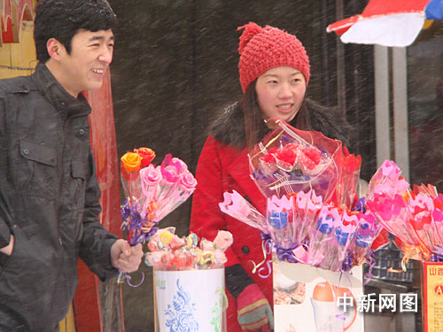 雖然今年春節(jié)和情人節(jié)相撞,年青人還是買禮物送給日思夜想的情人,也給新春佳節(jié)增添了幾許浪漫的氣氛。(完)