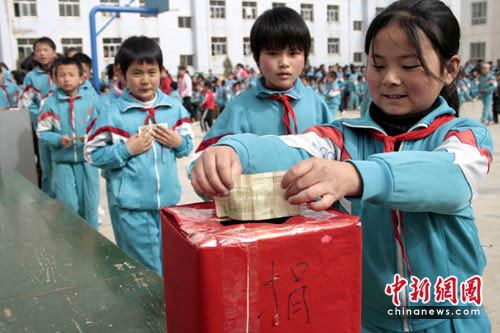 3月30日,甘肅積石山縣吹麻灘小學(xué)組織全校學(xué)生開展“每人捐贈(zèng)一瓶飲用水”活動(dòng),為西南旱區(qū)盡一點(diǎn)綿薄之力,為災(zāi)區(qū)小朋友送去一片愛心。積石山保安族東鄉(xiāng)族撒拉族自治縣是中國保安族的主要聚居地,也是甘肅省唯一的一個(gè)多民族自治縣。積石山是國家級貧困縣,1998年開始,由國僑辦定點(diǎn)幫扶。滕漢霞 攝