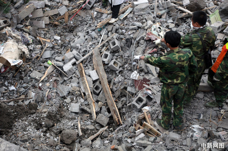 7日下午18時17分,在這所垮塌的民房中,救援人員發(fā)現(xiàn)一名遇難者遺體,隨后在旁邊又發(fā)現(xiàn)有遇難者遺體。救援人員現(xiàn)場還挖出一些衣物、被褥、書籍、賬本及保險柜等。 曹多然 攝