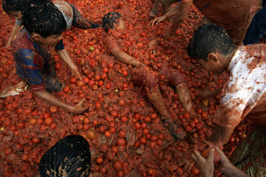 2009年6月14日,哥倫比亞第五屆番茄狂歡節(jié)開幕,參與者互相投擲西紅柿,盡情狂歡慶豐收。來自哥倫比亞各地的狂歡者們云集在首都波哥大東北部的蘇塔馬錢小鎮(zhèn),街道上立刻變成了西紅柿紛飛的戰(zhàn)場。雖然每個人的臉上身上沾滿了西紅柿汁,但人們還是樂此不疲又是丟又是砸,把成堆的西紅柿當成打仗的“武器”。還有人特地穿上白衣白褲,身上越紅,心里就越痛快。