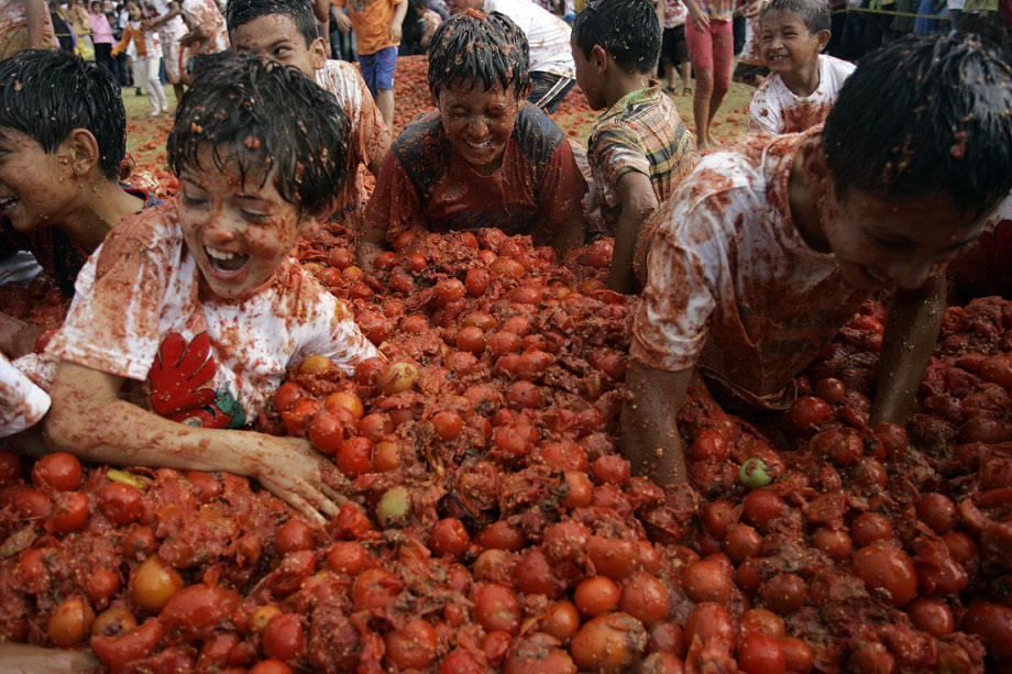 2009年6月14日,哥倫比亞第五屆番茄狂歡節(jié)開幕,參與者互相投擲西紅柿,盡情狂歡慶豐收。來自哥倫比亞各地的狂歡者們云集在首都波哥大東北部的蘇塔馬錢小鎮(zhèn),街道上立刻變成了西紅柿紛飛的戰(zhàn)場。雖然每個人的臉上身上沾滿了西紅柿汁,但人們還是樂此不疲又是丟又是砸,把成堆的西紅柿當成打仗的“武器”。還有人特地穿上白衣白褲,身上越紅,心里就越痛快。