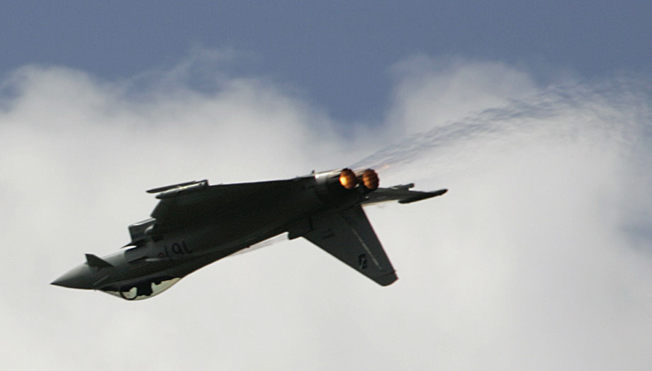 圖為歐洲臺(tái)風(fēng)戰(zhàn)斗機(jī)進(jìn)行飛行表演。