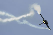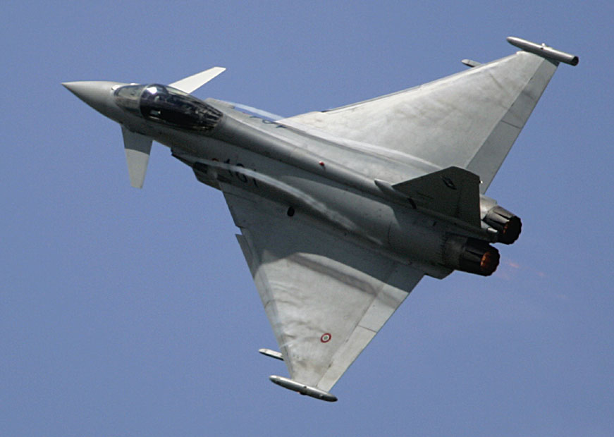 圖為歐洲臺風(fēng)戰(zhàn)斗機進行飛行表演。
