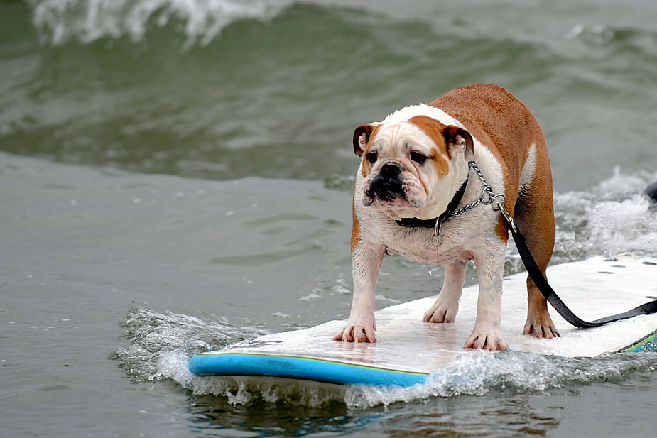圖為小狗沖浪比賽現(xiàn)場。