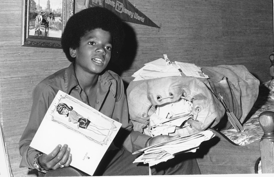 1972年,邁克爾·杰克遜在圣費(fèi)爾南多谷的家中展示歌迷寄來(lái)的明信片。