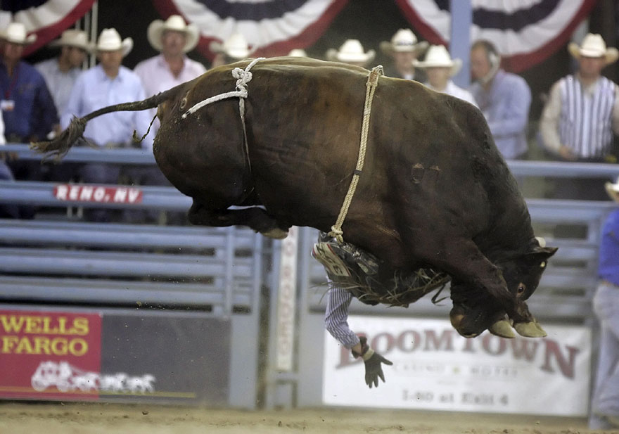 6月26日,在美國(guó)內(nèi)華達(dá)州舉行了一場(chǎng)驚險(xiǎn)刺激的騎牛大賽,各路馴牛勇士各顯身手,希望能夠征服這些狂野的莽牛。