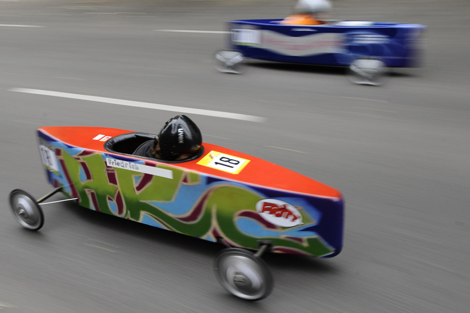 6月28日,德國(guó)柏林的德比郡舉行了第50屆“肥皂盒”競(jìng)速賽車,該賽車沒(méi)有動(dòng)力裝置,參賽者親手打造的“賽車”更使比賽妙趣橫生。