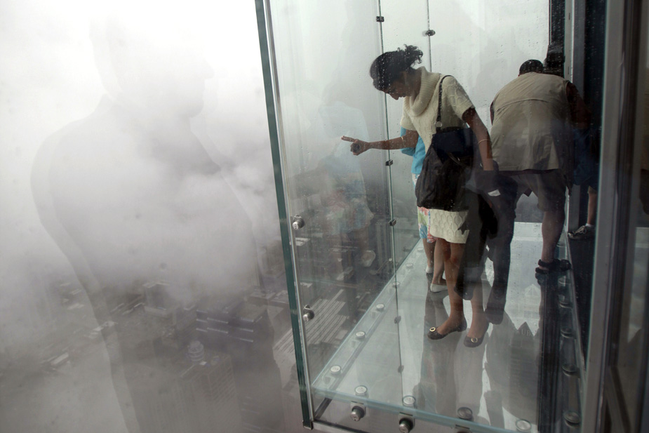 7月1日,美國芝加哥,西爾斯大廈在第103層瞭望臺增設的玻璃陽臺對媒體開放。這些玻璃陽臺建在大廈西側,從瞭望臺向外延伸約1.2米。陽臺的玻璃地板厚達12.7厘米,可承重約5噸。