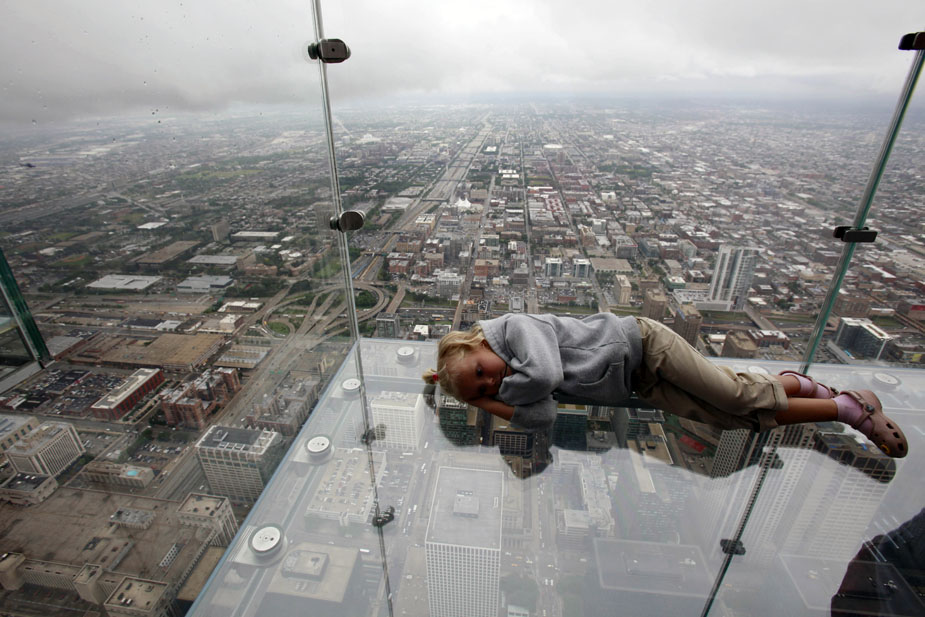 7月1日,美國芝加哥,西爾斯大廈在第103層瞭望臺增設(shè)的玻璃陽臺對媒體開放。這些玻璃陽臺建在大廈西側(cè),從瞭望臺向外延伸約1.2米。陽臺的玻璃地板厚達(dá)12.7厘米,可承重約5噸。
