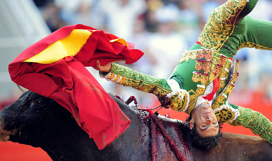 7月5日,西班牙巴塞羅那舉行了一場驚險的斗牛比賽,一位斗牛士在與牛較量時被牛頂起,所幸該人“武功”高強未造成大的傷害。