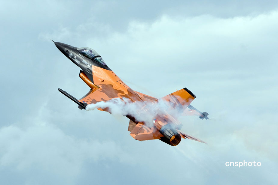 2009年7月,“2009英國(guó)費(fèi)爾福德航展”在英格蘭費(fèi)爾福德開(kāi)展。圖為荷蘭皇家空軍F-16戰(zhàn)斗機(jī),荷蘭皇家空軍此次以少見(jiàn)的橙色圖裝F-16戰(zhàn)斗機(jī)在航展上亮相。中新社發(fā) 潘禹 攝