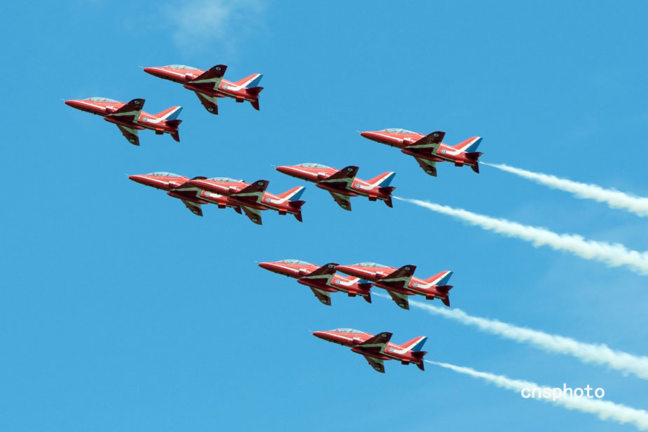 2009年7月,“2009英國(guó)費(fèi)爾福德航展”在英格蘭費(fèi)爾福德開(kāi)展。圖為“紅箭(Red Arrows)”密集編隊(duì)飛行。中新社發(fā) 潘禹 攝