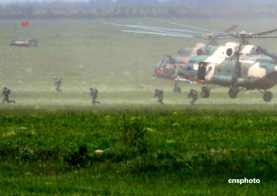中國(guó)、俄羅斯兩軍總參謀長(zhǎng),7月23日上午到沈陽(yáng)軍區(qū)洮南合同戰(zhàn)術(shù)訓(xùn)練基地,觀看“和平使命2009”聯(lián)合反恐軍事演習(xí)。雙方以陸軍和空軍為主,中方參演部隊(duì)包括1個(gè)陸軍戰(zhàn)斗群和1個(gè)空軍戰(zhàn)斗群。俄方參演兵力包括1個(gè)陸軍加強(qiáng)摩步營(yíng)、1個(gè)空降突擊連和部分空軍兵力,雙方投入兵力兩千多人。中新社發(fā) 宋吉河 攝