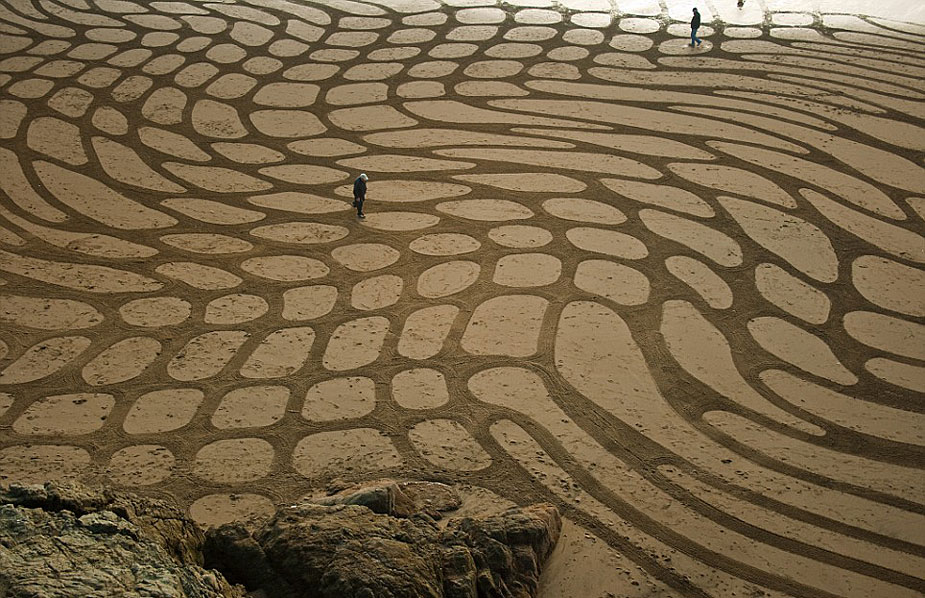據(jù)英國(guó)媒體7月27日?qǐng)?bào)道,藝術(shù)家Andres Amador用耙子在沙灘上作畫(huà),眾多中心對(duì)稱的幾何圖形,不在乎是否能長(zhǎng)久保留,但求被海浪帶走前與大自然的完美融合。