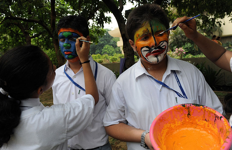 7月28日,約2000名學(xué)生在新德里化妝成老虎的臉譜,圍坐成老虎的造型,與官員和野生動物專家們一起呼吁人們保護(hù)孟加拉虎和其他野生動物。