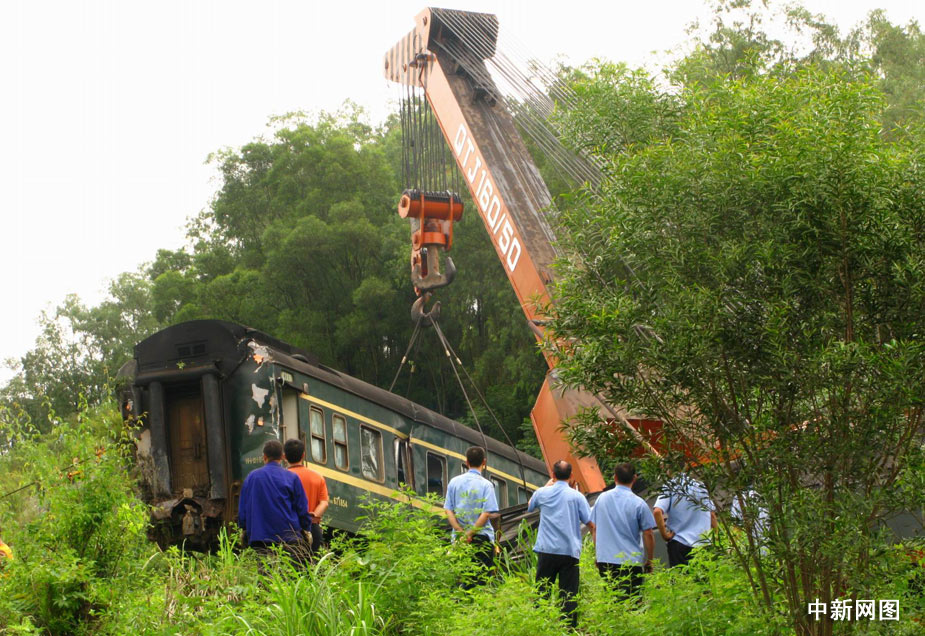 2009年7月29日4時22分,由襄樊開往湛江的1473次旅客列車運(yùn)行至焦柳線廣西境內(nèi)古砦至寨隆間,因連日持續(xù)強(qiáng)降雨造成山體崩塌掩埋線路,列車機(jī)車及機(jī)后1-4位車輛脫軌,造成4名旅客死亡,50余名旅客受傷,焦柳線中斷行車。曹偉軍 攝