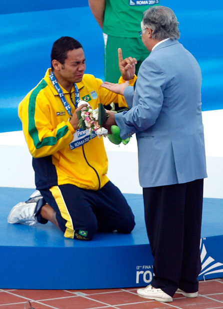 “能再給我一塊嗎?”——7月29日,巴西選手席爾瓦獲得男子50米蛙泳銀牌后長跪在領(lǐng)獎(jiǎng)臺(tái)上。