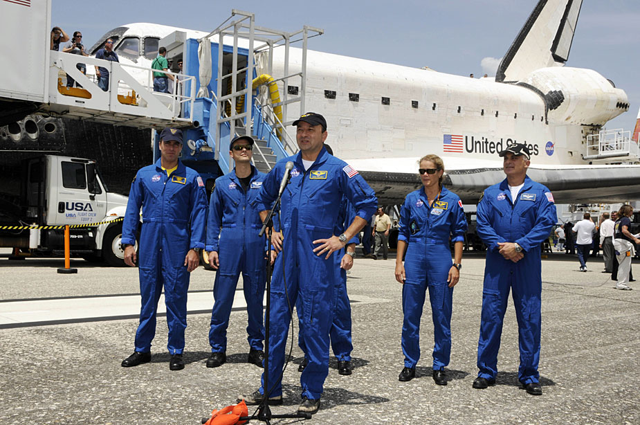 圖為與奮進(jìn)號(hào)一起返回地面的宇航員在航天飛機(jī)前合影留念。