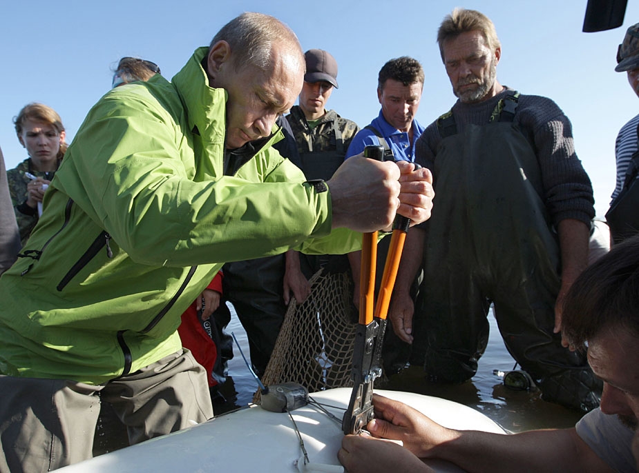 俄羅斯總理普京7月31日在太平洋的契卡洛夫島為一條白鯨裝上衛(wèi)星追蹤器。其后他更幫手喂其他白鯨魚吃。