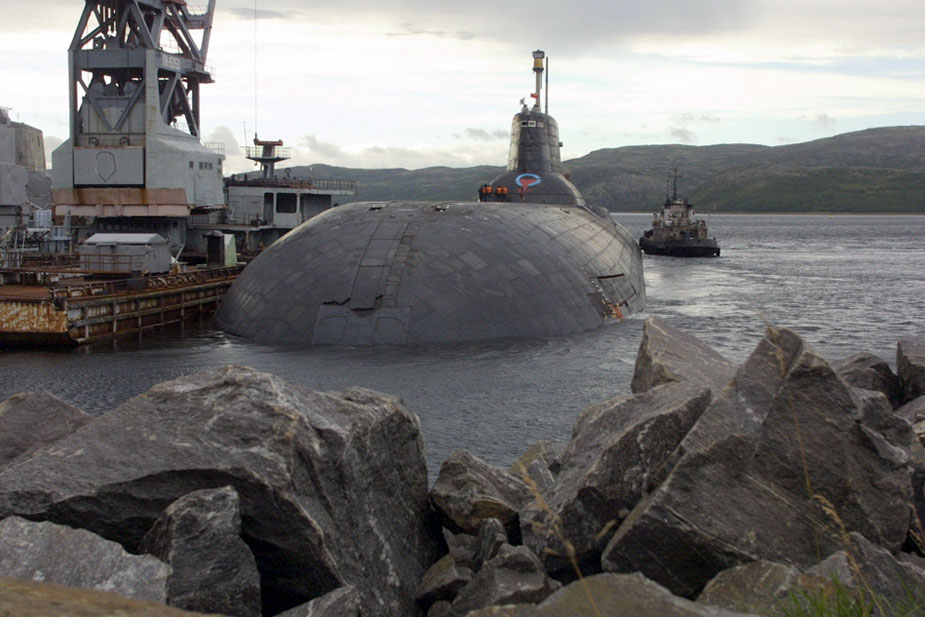 圖為停靠碼頭的俄軍臺風(fēng)級巨獸核潛艇。