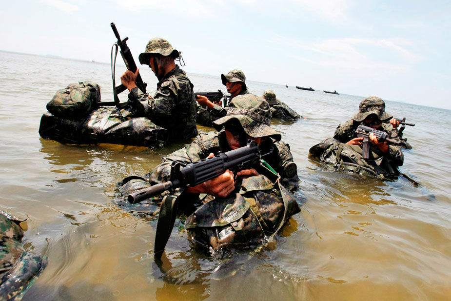 2009年8月5日,韓國特種戰(zhàn)司令部特種作戰(zhàn)分隊在南泰安郡演練海上滲透攻擊。