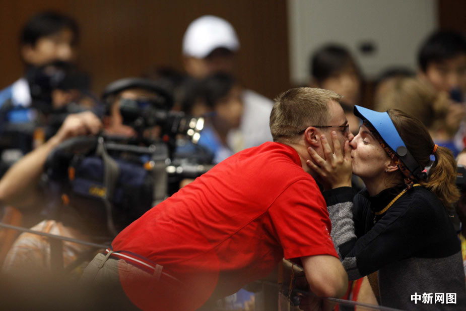 擊落頭金—— 8月9日,北京奧運會開賽的第一天,女子10米氣步槍決賽在北京射擊館進(jìn)行。捷克選手卡特日娜·埃蒙斯以503.5環(huán)獲得金牌,同時也是本屆奧運會產(chǎn)生的首枚金牌。圖為埃蒙斯獲勝后親吻丈夫。
