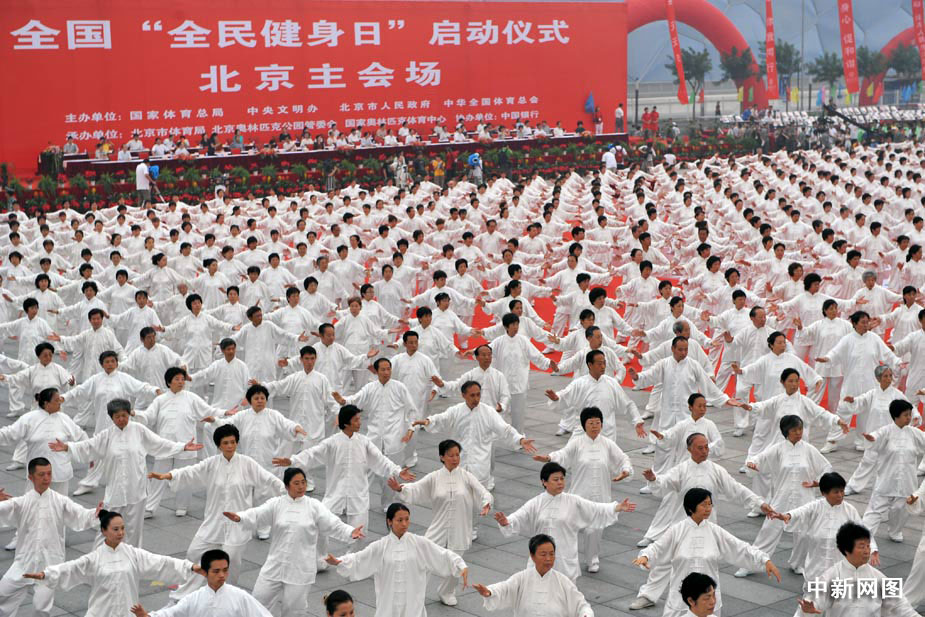 8月8日,全國首個“全民健身日”北京主會場啟動儀式上,三萬多群眾進(jìn)行太極拳展示活動,在世界吉尼斯總部認(rèn)證官員的見證下成功打破世界紀(jì)錄。中新網(wǎng)記者 金碩 攝
