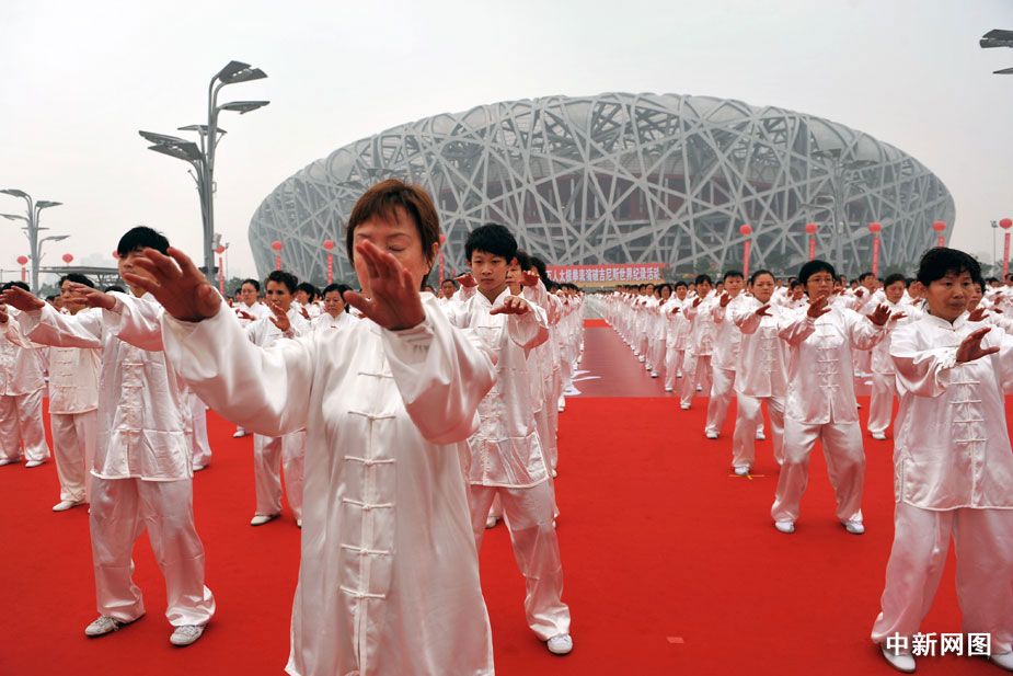 8月8日,全國首個(gè)“全民健身日”北京主會場啟動(dòng)儀式上,三萬多群眾進(jìn)行太極拳展示活動(dòng),在世界吉尼斯總部認(rèn)證官員的見證下成功打破世界紀(jì)錄。中新網(wǎng)記者 金碩 攝