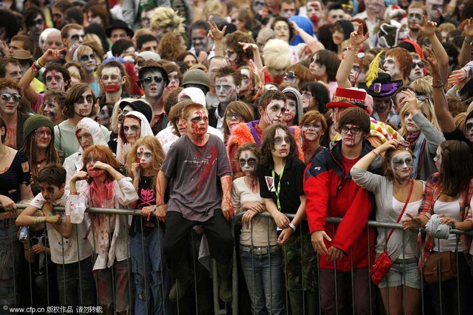 2009年8月6日,英國赫里福德郡Eastnor城堡,人們化裝成“僵尸”出現(xiàn)在大寒音樂節(jié)上,欲打破同一地點(diǎn)聚集最多“僵尸”的世界紀(jì)錄。
