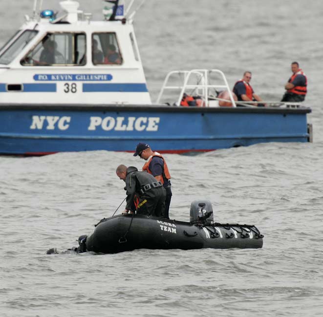 8月8日,紐約市曼哈頓西側(cè)的哈德遜河上空,一架觀光直升飛機(jī)和一架小型飛機(jī)相撞,兩飛機(jī)雙雙墜入河中。據(jù)稱觀光直升飛機(jī)上載有五名意大利游客和一名飛行員,而小型飛機(jī)上則有三人。圖為工作人員在現(xiàn)場(chǎng)救援。