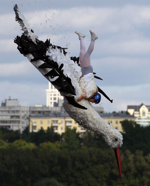 8月9日,莫斯科河畔舉辦一年一度的“墜落節(jié)”,表演者帶著自己設(shè)計(jì)制作的各種“飛行器”勇敢的從高空跳入水中。