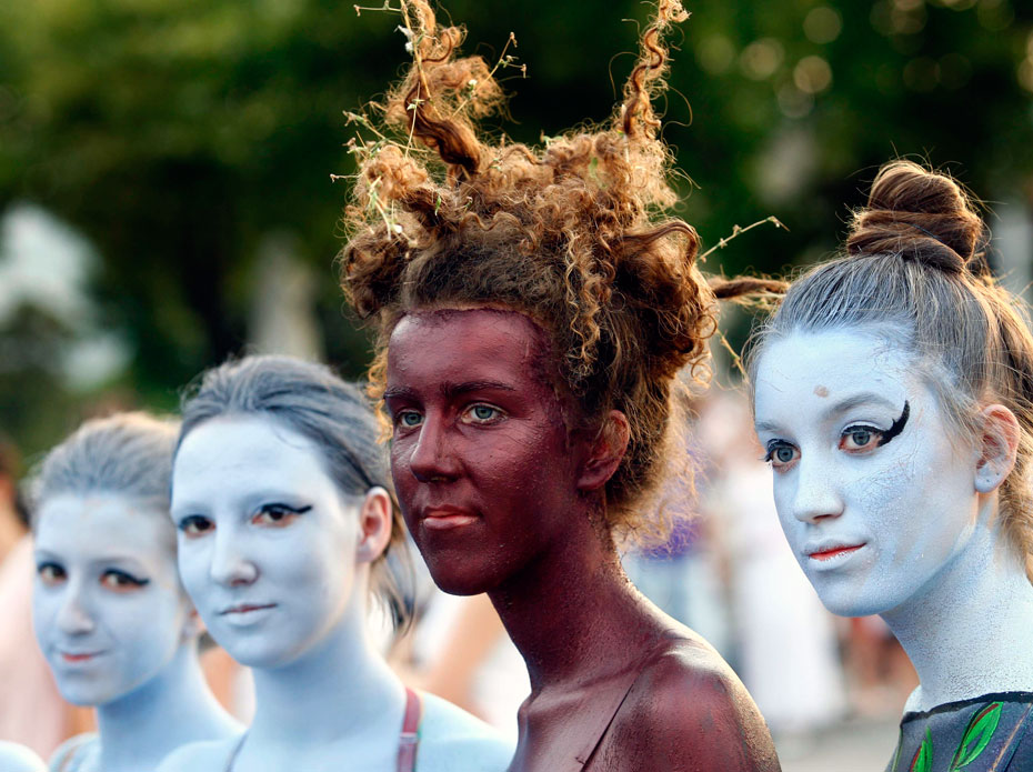 圖為參加狂歡節(jié)的人們?cè)谀樕线M(jìn)行“涂鴉”。