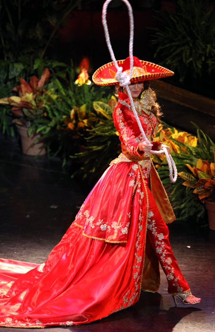 圖為墨西哥小姐卡瑞羅穿著融入民族元素的服飾登臺展示。