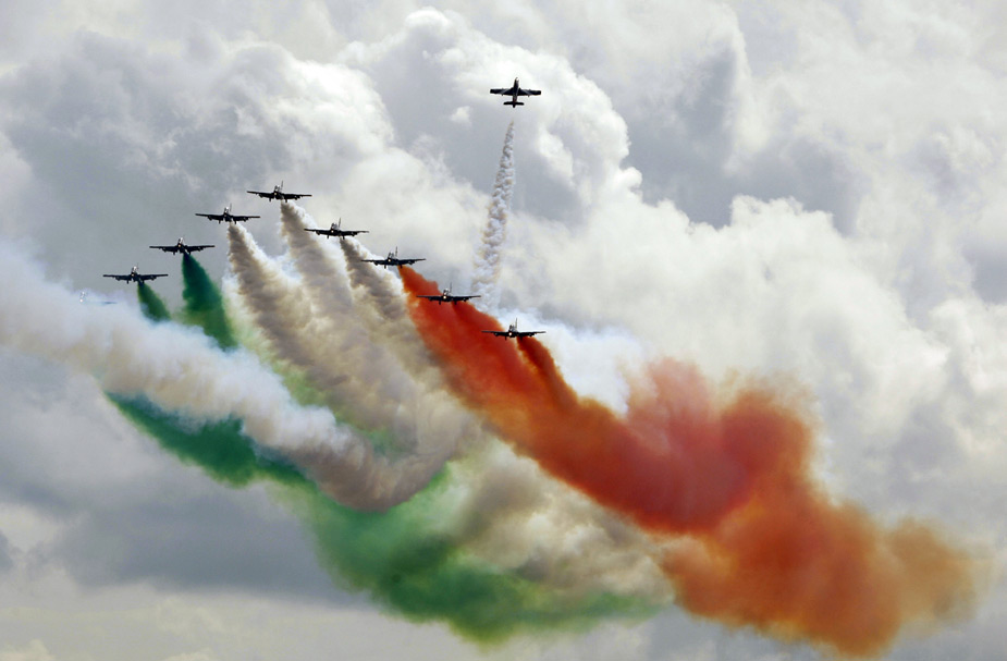 圖為意大利空軍“三色箭”飛行隊精彩的特技飛行表演。