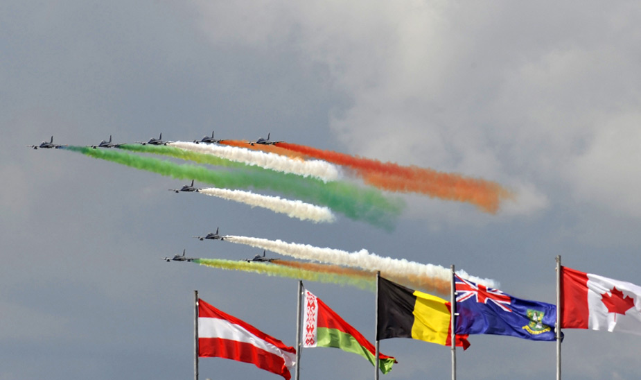8月19日,在俄羅斯茹科夫斯基市舉行的國際航空航天展上,意大利空軍“三色箭”飛行表演隊(duì)奉獻(xiàn)精彩的飛行表演。
