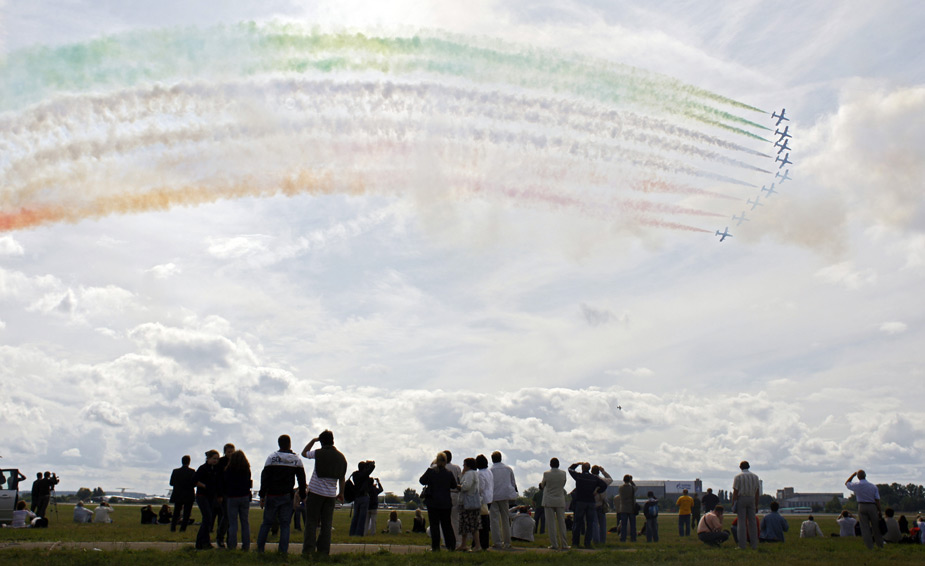 圖為觀眾在觀看意大利空軍“三色箭”飛行隊(duì)精彩的特技飛行表演。