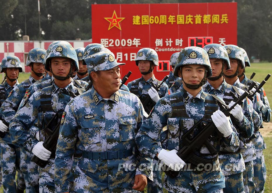 9月3日,解放軍官兵在位于北京郊區(qū)的一處徒步方隊(duì)閱兵村內(nèi)訓(xùn)練。今年國(guó)慶節(jié)將舉行新中國(guó)成立60周年國(guó)慶首都盛大閱兵儀式。來(lái)源:中國(guó)軍網(wǎng)
