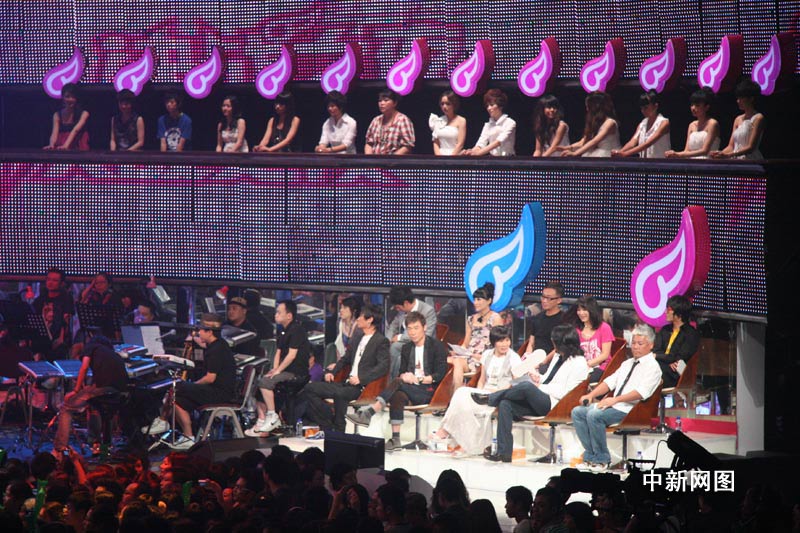 9月4日,湖南衛(wèi)視“2009快樂(lè)女聲”進(jìn)行最后的總決賽。江映蓉、黃英、李霄云這3強(qiáng)選手將通過(guò)18首歌曲的演繹,向全國(guó)總冠軍發(fā)起最后沖擊。圖為現(xiàn)場(chǎng)的評(píng)審。劉雙雙攝