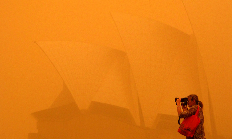 澳大利亞悉尼23日出現(xiàn)罕見的沙塵暴,加上風(fēng)速每小時上百公里的強風(fēng)吹襲,全城籠罩在一片橘紅色的塵霧中,由于能見度相當(dāng)?shù),飛機和渡輪暫時停飛或停駛。