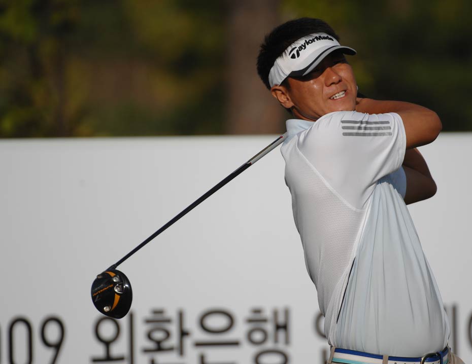 2009“韓國KEB銀行”中韓職業(yè)高爾夫球巡回賽韓國站于今天在韓國OSTAR高爾夫球俱樂部正式開桿,有47名球員代表中國參賽。圖為選手們上場第一天,揮桿開打的場面。