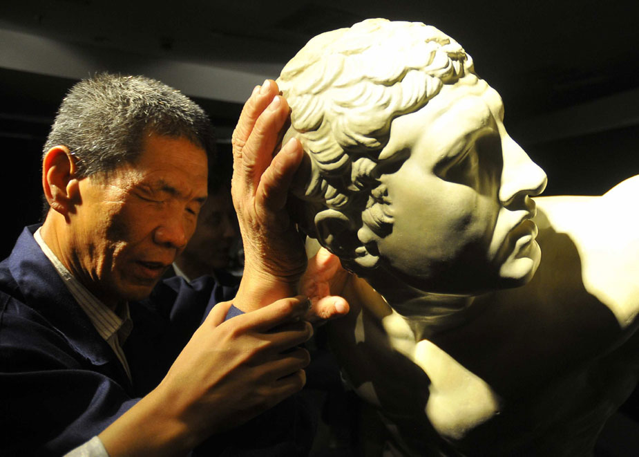 21日,由法國(guó)盧浮宮博物館、中華世紀(jì)壇世界藝術(shù)館等機(jī)構(gòu)聯(lián)合主辦的《觸·覺(jué)——從盧浮宮到世紀(jì)壇》藝術(shù)展在中華世紀(jì)壇世界藝術(shù)館開幕,共展出公元前二世紀(jì)到十九世紀(jì)西方經(jīng)典雕塑的復(fù)制品和中國(guó)當(dāng)代藝術(shù)品二十三件。這是中國(guó)大陸首次為視覺(jué)殘障人士舉辦的藝術(shù)展。該展十一月起開始在福州、武漢及香港等地巡展。圖為視障人士利用觸覺(jué)方式欣賞精典作品。潘旭臨 攝圖片來(lái)源:中國(guó)新聞網(wǎng)