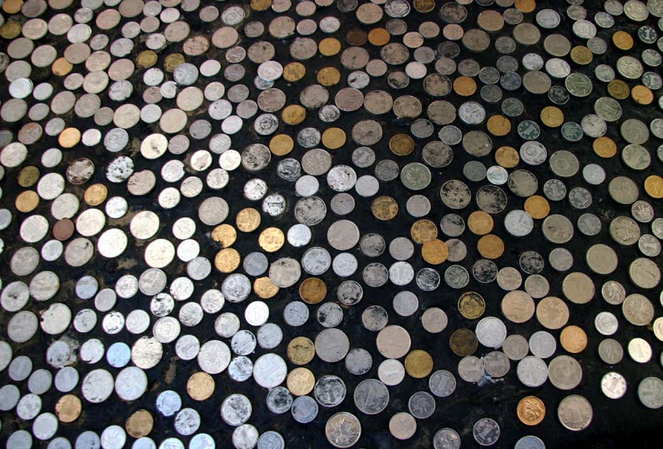 扎什倫布寺里的一處圣跡,即高僧大德觸摸或者蒞臨過的地方。墻上抹過酥油,有了粘性,信徒朝拜路過時(shí)會粘貼銀幣于其上,有如在廟堂敬獻(xiàn)錢幣。