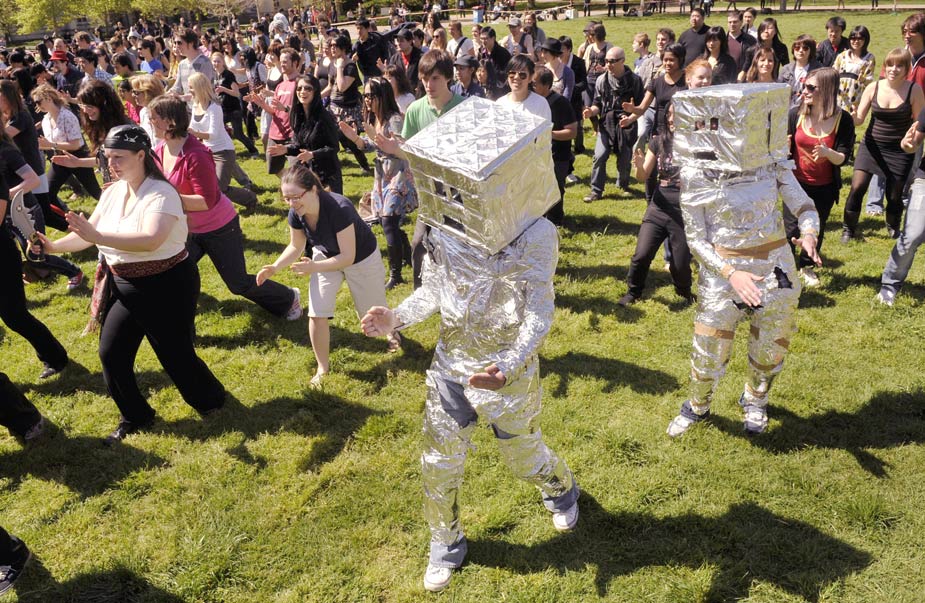 9月29日,379名澳大利亞學(xué)生在草坪上齊刷刷地跳起了“機(jī)器人舞”,打破了集體跳“機(jī)器人舞”的世界紀(jì)錄。其中還有一些學(xué)生從頭到腳裹上了金屬箔紙,還有一些身穿海盜服裝。此前集體跳“機(jī)器人舞”的紀(jì)錄保持者是276名來自英國(guó)肯特大學(xué)的學(xué)生。