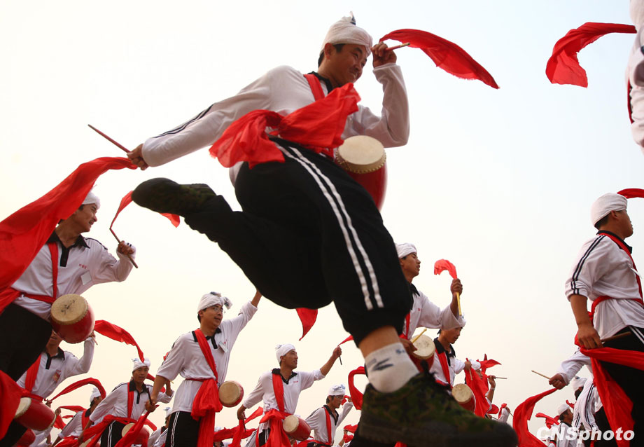 9月16日,千余名來自陜西安塞的腰鼓隊員在北京密云訓練基地和其他方陣合練。該方陣隊員全部是來自陜西省延安市安塞縣的農(nóng)民,10月1日他們將走在群眾游行隊伍中,在天安門城樓前舞起安塞腰鼓。該方陣也是群眾游行隊伍中唯一一支京外隊伍,唯一一個全部由農(nóng)民組成的方陣。 中新社發(fā) 杜洋 攝