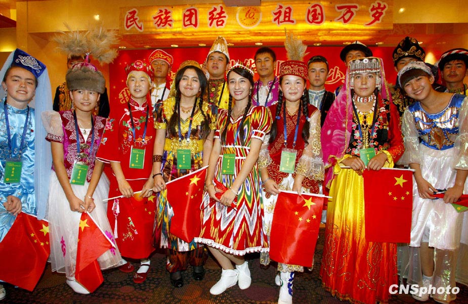 9月24日晚,“我愛我的祖國——中華各民族青少年同心營”在北京開營。本次同心營活動從全國56個(gè)民族中挑選男女各一名優(yōu)秀學(xué)生代表共計(jì)112人進(jìn)京參加,在北京期間,營員們不僅將與北京少先隊(duì)員一起繡國旗,國慶當(dāng)天,他們將穿上本民族的服飾,組成“國旗禮儀隊(duì)”,簇?fù)碓谔彀查T廣場國旗旗桿下,代表56個(gè)民族的青少年共迎國旗。中新社發(fā) 鄭雄增 攝