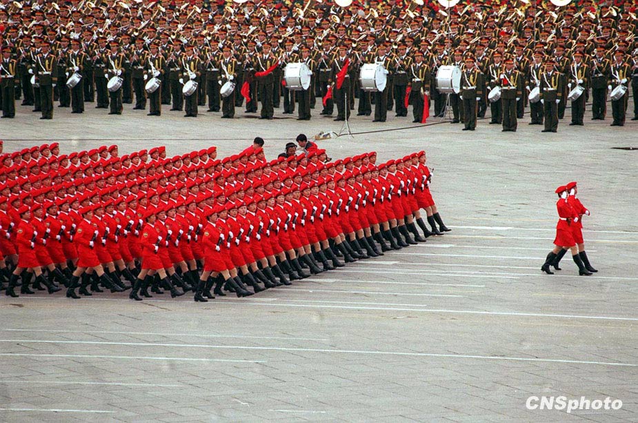 國慶50周年閱兵的女民兵方隊經過天安門廣場。中新社發(fā)