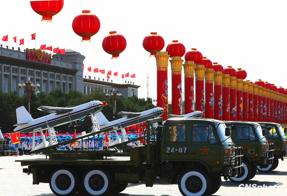 2009年10月1日,中華人民共和國成立60周年慶祝大會在北京天安門廣場舉行。圖為無人機方隊接受檢閱。中新社發(fā) 宋吉河 攝