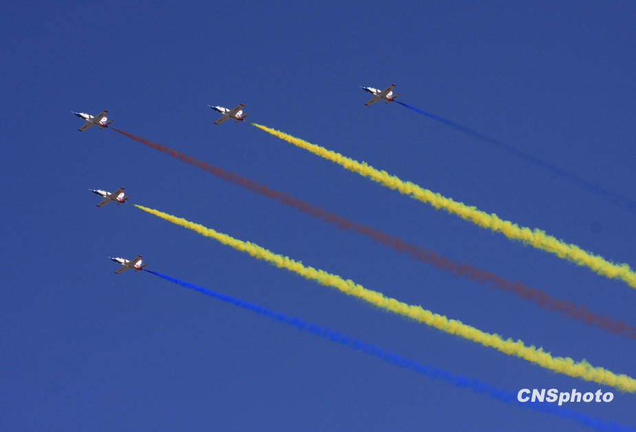 2009年10月1日,中華人民共和國成立60周年慶祝大會在北京天安門廣場舉行。圖為教練機梯隊飛過天安門廣場上空。中新社發(fā) 郭國權(quán) 攝